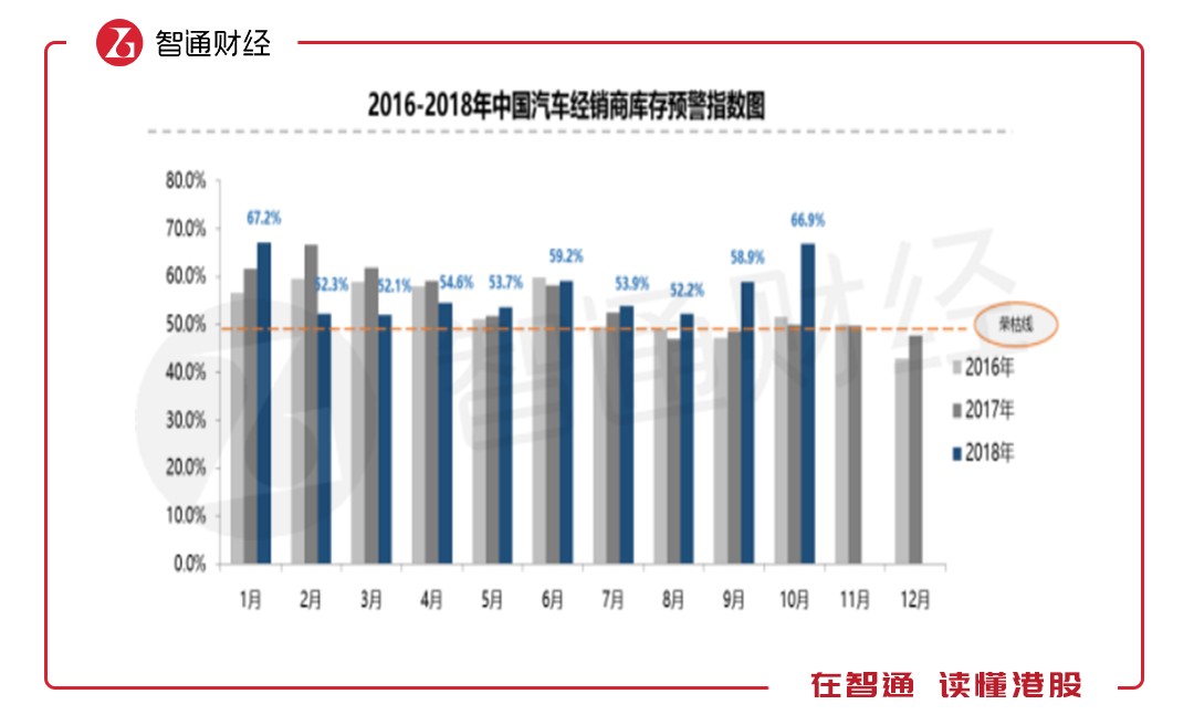 實(shí)際上,從汽車制造到最終消費(fèi)者,流通過程要通過經(jīng)銷商,中汽協(xié)近日公布了經(jīng)銷商庫存預(yù)警指數(shù),顯示下半年以來,庫存預(yù)警指數(shù)均高于前兩年,10月份創(chuàng)出新高,預(yù)警指數(shù)達(dá)66.9%,而榮枯線為50%,汽車庫存堪憂,未來兩個月消化難度依然很大。