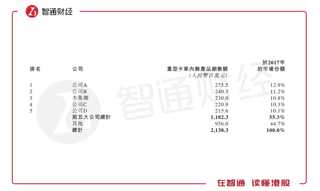 根據(jù)弗若斯特沙利文報(bào)告,按重型卡車(chē)內(nèi)飾產(chǎn)品的銷(xiāo)售額計(jì),公司是中國(guó)西北最大的重型卡車(chē)內(nèi)飾產(chǎn)品制造商(2017年市場(chǎng)份額達(dá)62.7%)及中國(guó)的第三大制造商(2017年市場(chǎng)份額達(dá)10.8%);按汽車(chē)內(nèi)飾產(chǎn)品的銷(xiāo)售額計(jì),公司是中國(guó)西北第二大汽車(chē)內(nèi)飾產(chǎn)品制造商(2017年市場(chǎng)份額達(dá)15.6%)及中國(guó)第十四大制造商(2017年市場(chǎng)份額達(dá)0.4%)。