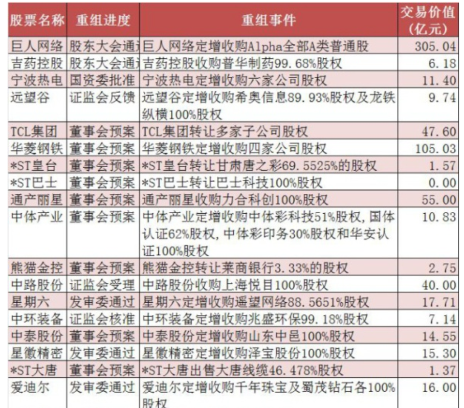 并購重組經(jīng)歷近二年的低谷后,政策由緊到松,目前快速回暖,概念股逐步走強(qiáng),近日又有多家公司公布并購方案;