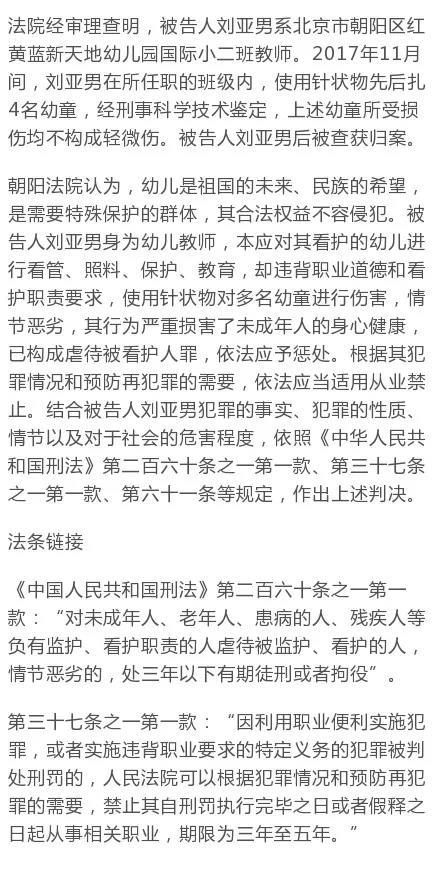 智通財(cái)經(jīng)APP獲悉,12月26日上午,北京市朝陽區(qū)人民法院依法對被告人劉亞男(紅黃藍(lán)幼兒園教師)虐待被看護(hù)人案公開宣判,以虐待被看護(hù)人罪一審判處劉亞男有期徒刑一年六個月,同時禁止其自刑罰執(zhí)行完畢之日或者假釋之日起五年內(nèi)從事未成年人看護(hù)教育工作。(肖順蘭)