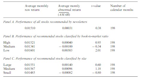 此外,美國(guó)學(xué)者Jaffe和Mahoney在1999年的一篇學(xué)術(shù)論文《The performance of investment newsletters》中,對(duì)1980-1996年間的近100份投資預(yù)測(cè)的系統(tǒng)性分析后得出結(jié)論,稱這些投資建議的回報(bào)還不及它們所對(duì)應(yīng)的比較基準(zhǔn)。也就是說(shuō),這些專家提供的薦股服務(wù)的價(jià)值為零。