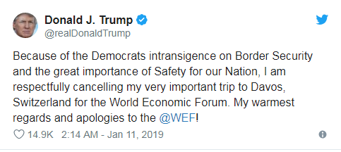 特朗普表示,由于民主黨在邊境安全問題上的頑固態(tài)度和國家安全的重要性,他謹(jǐn)慎地取消前往瑞士達(dá)沃斯參加世界經(jīng)濟(jì)論壇的行程,并向世界經(jīng)濟(jì)論壇致以問候和歉意。另外,美國政府高級官員表示,即使本月晚些時(shí)候政府仍處于關(guān)閉狀態(tài),美國財(cái)政部長姆努欽將帶領(lǐng)美國政府代表團(tuán)出席達(dá)沃斯論壇。