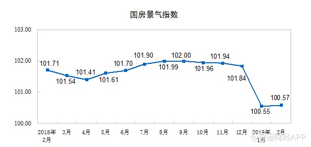 2月份,房地產(chǎn)開發(fā)景氣指數(shù)(簡(jiǎn)稱“國(guó)房景氣指數(shù)”)為100.57,比2018年12月份回落1.27點(diǎn)。