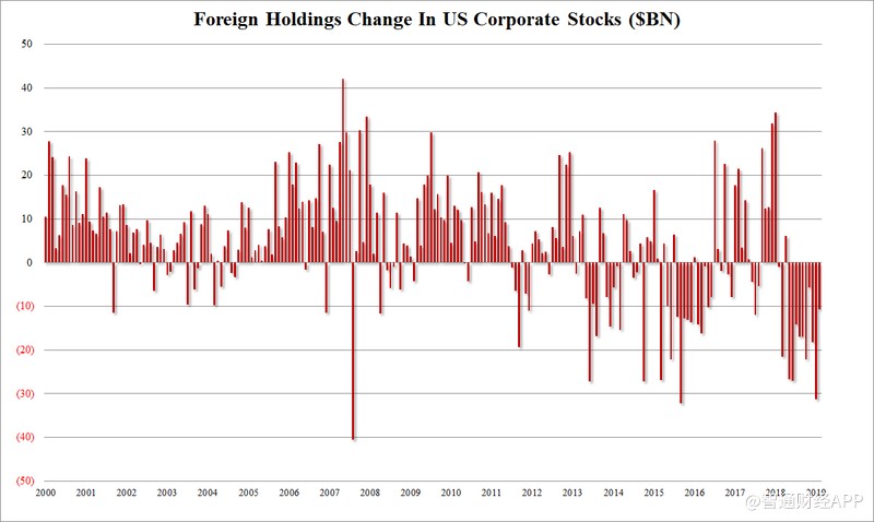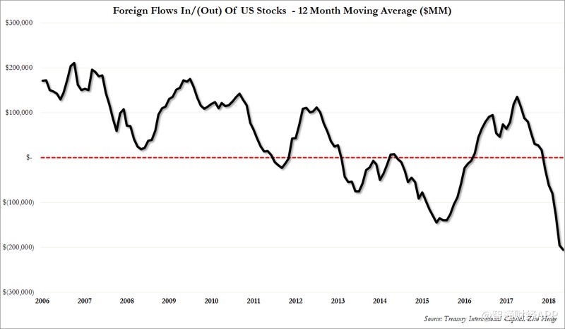 根據(jù)TIC數(shù)據(jù)顯示,外國(guó)投資者連續(xù)第10個(gè)月和過(guò)去13個(gè)月中的12個(gè)月賣出美國(guó)股票,創(chuàng)歷史新高: