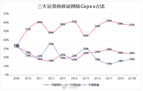 過(guò)去十年,中國(guó)移動(dòng)占比三大運(yùn)營(yíng)商總資本開支的范圍基本處于50%-60%區(qū)間,電信占比20-30%,聯(lián)通15%-30%。