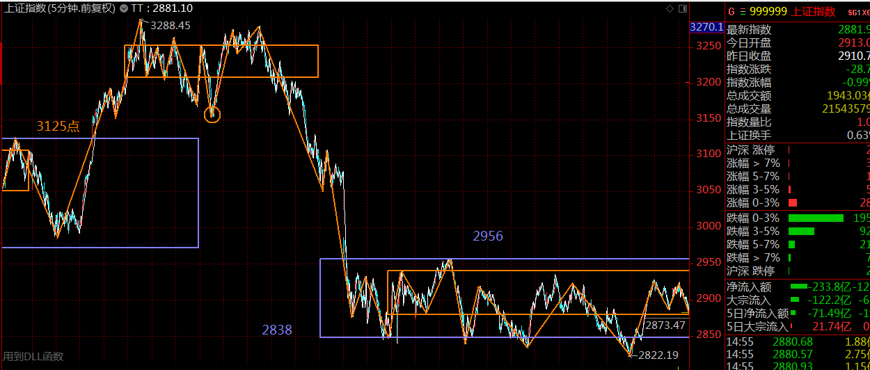 下圖為上證指數(shù)五分鐘級(jí)別走勢(shì)結(jié)構(gòu)。目前下面五分鐘中樞已出現(xiàn)中樞擴(kuò)展的情況,即擴(kuò)展為藍(lán)色框線的三十分鐘中樞。目前來(lái)看,屬于中樞震蕩的走勢(shì)結(jié)構(gòu),關(guān)注接近2838點(diǎn)的盤(pán)整背馳機(jī)會(huì),以及接近2956點(diǎn)的壓力大小。本周初,指數(shù)可能還會(huì)繼續(xù)下探2938點(diǎn),在出現(xiàn)該中樞的三賣之前,低于2838點(diǎn),都是低吸的機(jī)會(huì)。