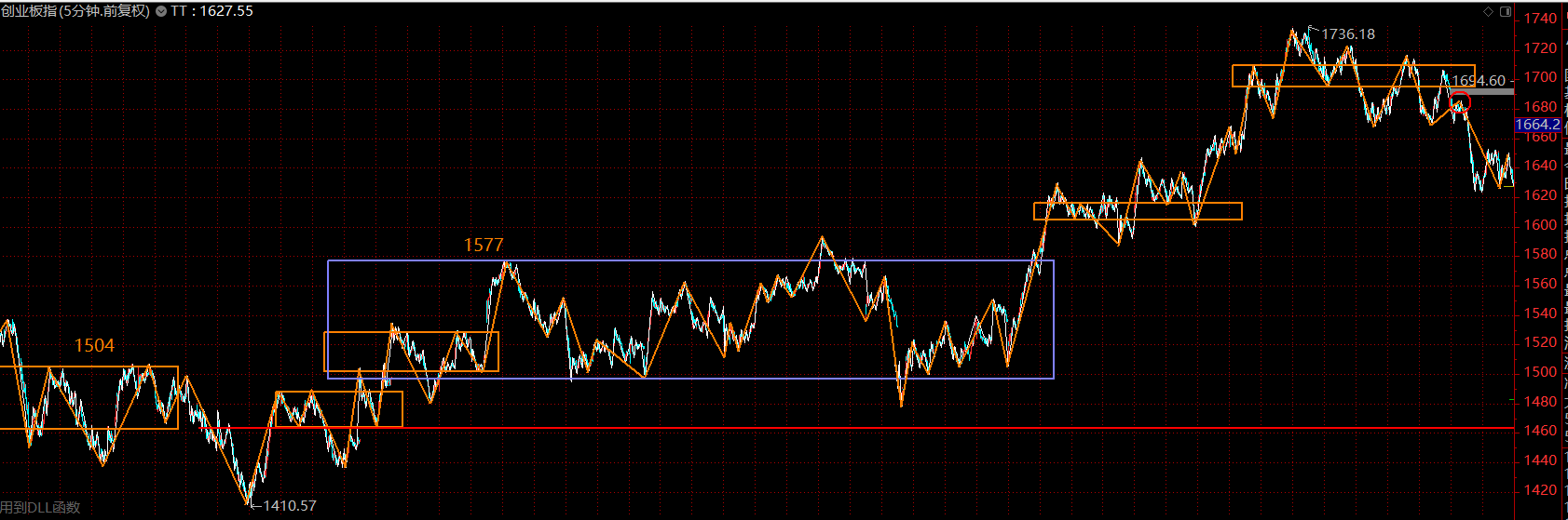 本輪行情的領(lǐng)先指數(shù)——?jiǎng)?chuàng)業(yè)板指數(shù)仍舊為多頭排列,目前同樣進(jìn)入了五分鐘下跌趨勢(shì)第二個(gè)中樞的構(gòu)建過(guò)程,可依托1600-1620區(qū)域展開(kāi)布局。
