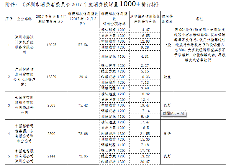 附件:《深圳市消費者委員會2017年度消費投訴量1000+排行榜》