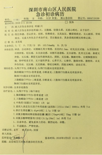 第二天,張女士立刻去深圳市南山區(qū)人民醫(yī)院急診科就診,初步診斷為“全身多處挫傷”。羅小姐說(shuō),“當(dāng)時(shí)的法醫(yī)鑒定結(jié)果是輕微傷,法醫(yī)鑒定貼好封條交給了派出所?!?/p>
