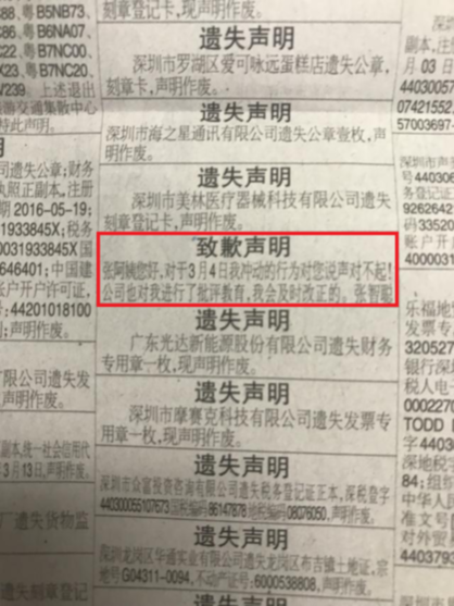 在3月24日的報(bào)紙上,記者在整版密密麻麻的分類信息中,終于找到了埋藏在其中的一條“致歉聲明”——“張阿姨您好,對(duì)于3月4日我沖動(dòng)的行為對(duì)您說(shuō)聲對(duì)不起!公司也對(duì)我進(jìn)行了批評(píng)教育,我會(huì)及時(shí)改正的?!庇浾呗?lián)系該版服務(wù)熱線,對(duì)方表示登報(bào)這則致歉聲明的價(jià)格為200元左右。(田志強(qiáng))