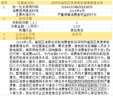 2018年1月,福田區(qū)消委會(huì)收到消費(fèi)者投訴深圳市福田區(qū)美度美膚健康管理會(huì)所,稱(chēng)經(jīng)營(yíng)者亂扣費(fèi),要求退回余額(會(huì)員卡余額1737元)。接到投訴后調(diào)解人員多次致電商家,商家楊姓負(fù)責(zé)人回電解釋?zhuān)合到y(tǒng)顯示消費(fèi)者的會(huì)員卡在1月4日只有一筆消費(fèi)448元,卡內(nèi)余額1737元;消費(fèi)者反映的收到扣款短信是店員短信發(fā)送的操作失誤,實(shí)際并未扣款,不存在故意欺詐行為。隨后商家電話一直無(wú)人接聽(tīng),福田區(qū)消委會(huì)于3月15日、3月19日、3月23日三次分別派出多名工作人員到商家經(jīng)營(yíng)地址(福田區(qū)濱河大道京基御景華城)進(jìn)行現(xiàn)場(chǎng)調(diào)查,現(xiàn)場(chǎng)大門(mén)緊閉,玻璃門(mén)上一直貼著“內(nèi)部培訓(xùn),暫停營(yíng)業(yè)”的告示,福田區(qū)消委會(huì)工作人員向大廈物業(yè)管理處了解情況,得知商家已關(guān)門(mén)停業(yè)數(shù)日,該商家疑似“跑路”。鑒于該商家在福田區(qū)消委會(huì)調(diào)查期間無(wú)故關(guān)門(mén)停業(yè)并失聯(lián),致使消費(fèi)者權(quán)益受到嚴(yán)重侵害,且福田區(qū)消委會(huì)多次遞送《約談通知書(shū)》到商家經(jīng)營(yíng)地,均無(wú)人接收。依據(jù)《深圳市消費(fèi)者委員會(huì)消費(fèi)維權(quán)信用信息管理辦法(試行)》第九條,我會(huì)將該企業(yè)信息推送至深圳市公共信用中心等征信機(jī)構(gòu)。