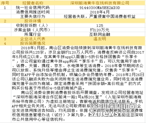 2018年1月起,南山區(qū)消委會(huì)陸續(xù)接到深圳前海黃牛在線科技有限公司投訴共125宗,涉及金額約120萬(wàn)人民幣。消費(fèi)者反映該公司自2017年5月成立以來(lái),在其黃牛拼app以面值3-5折價(jià)格拼團(tuán)售賣(mài)“樂(lè)享卡”,該公司宣稱(chēng)通過(guò)黃牛拼app購(gòu)買(mǎi)“享樂(lè)卡”后,可以用該卡充值油卡、話費(fèi)、天貓、攜程、京東、水電煤等生活消費(fèi)。最初消費(fèi)者購(gòu)買(mǎi)的“樂(lè)享卡”可正常用于生活消費(fèi)端充值,直至2018年春節(jié)期間該公司以放假、系統(tǒng)升級(jí)等理由停止生活消費(fèi)端充值,僅售賣(mài)“樂(lè)享卡”,同時(shí)在APP平臺(tái)添加會(huì)員機(jī)制,哄騙眾多會(huì)員繳納年費(fèi)。2018年2月26日該公司以融資失敗為由關(guān)閉所有生活消費(fèi)端充值業(yè)務(wù),同時(shí)將生活消費(fèi)端充值平臺(tái)改為商城,限定消費(fèi)者采用“拼團(tuán)余額+高價(jià)現(xiàn)金”的方式購(gòu)買(mǎi)價(jià)格高于市場(chǎng)價(jià)4-5倍的商城產(chǎn)品。