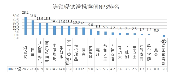 數(shù)據(jù)表明,此次調(diào)研餐飲品品牌整體的平均凈推薦值為9.4分。排名第一的是海底撈,凈推薦值為28.2分;其次是探魚(yú),凈推薦值為23.3分;第三名是八合里海記,凈推薦值為18.9分。前十名品牌依次為,海底撈、探魚(yú)、八合里海記、西貝莜面村、木屋燒烤、樂(lè)凱撒、太興(香港)餐廳、滿記甜品、唐宮、巴蜀風(fēng)。禾綠回轉(zhuǎn)壽司在此次調(diào)研中凈推薦值僅為-3.0分,在凈推薦值排名中墊底。