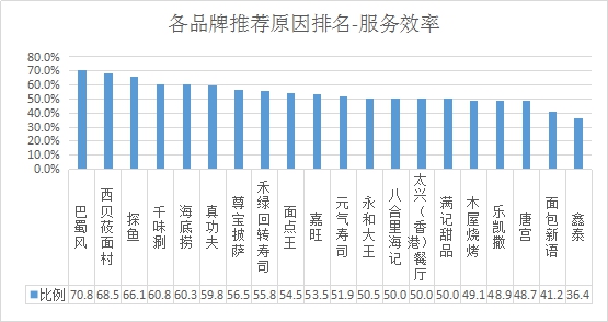 服務(wù)效率推薦率排名:排名前三的是巴蜀風(fēng)、西貝莜面村、探魚(yú);