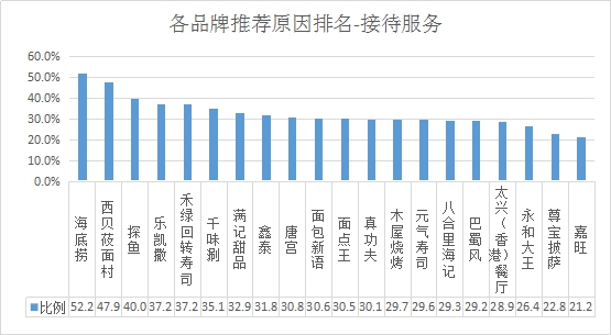 接待服務(wù)推薦率排名:排名前三的是海底撈、西貝筱面村、探魚(yú);