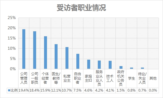 本次調(diào)研中,公司管理人員的比例最高,為19.4%,其次是公司一般職員,占比為18.4%;68.9%的受訪者其個人月收入超過8000元。