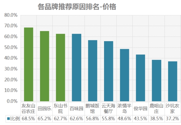 排名第一的是友友山谷農(nóng)莊,價(jià)格推薦率為68.5%;其次是田園樂(lè),推薦率為65.2%;第三名是東山書(shū)院,推薦率為62.7% 。