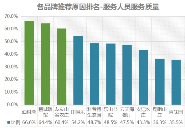 服務(wù)人員服務(wù)質(zhì)量推薦率排名前三依次為:油柑灣、鵬城飯館、友友山谷農(nóng)莊;