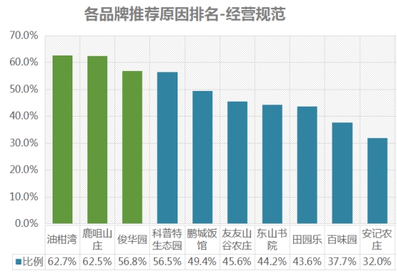 經(jīng)營(yíng)規(guī)范推薦率排名前三依次為:油柑灣、鹿咀山莊、俊華園;