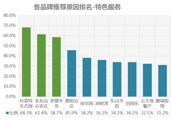 特色服務(wù)推薦率排名前三依次為:科普特生態(tài)園、友友山谷農(nóng)莊、濃情半島;