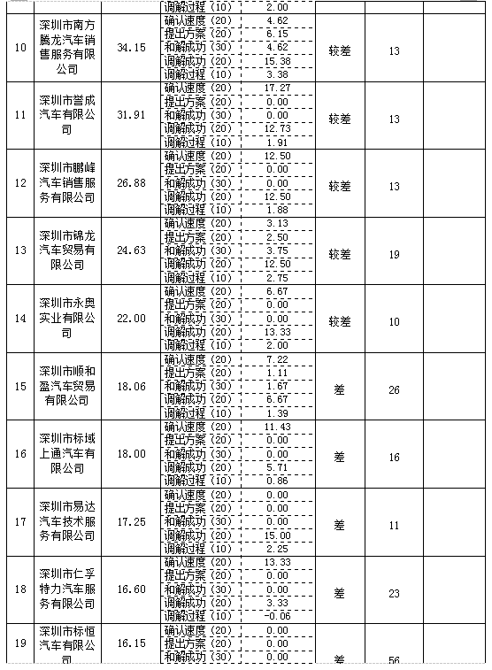 在細分指標方面,深圳市標域汽車有限公司、深圳標特汽車(集團)有限公司和深圳市宏創(chuàng)陸風汽車銷售有限公司等27家企業(yè)處理投訴不及時,未積極與消費者先行和解,導致其企業(yè)“確認速度”、“提出方案”和“和解成功”三項分項指標的分數皆為0,嚴重影響了企業(yè)的消費維權信用指數和信用等級。深圳市仁孚特力汽車服務有限公司、深圳市安進汽車貿易有限公司和深圳市大興寶譽汽車銷售服務有限公司在由消委會工作人員評分的“調解過程”分項指標分數為負分,3家企業(yè)存在不配合調解甚至拒絕調解的情況,解決消費糾紛的誠意度較差;另外,深圳市宏創(chuàng)陸風汽車銷售有限公司的消費維權信用指數為0,誠意度和滿意度為0,10宗消費投訴皆未處理成功,排名最后。