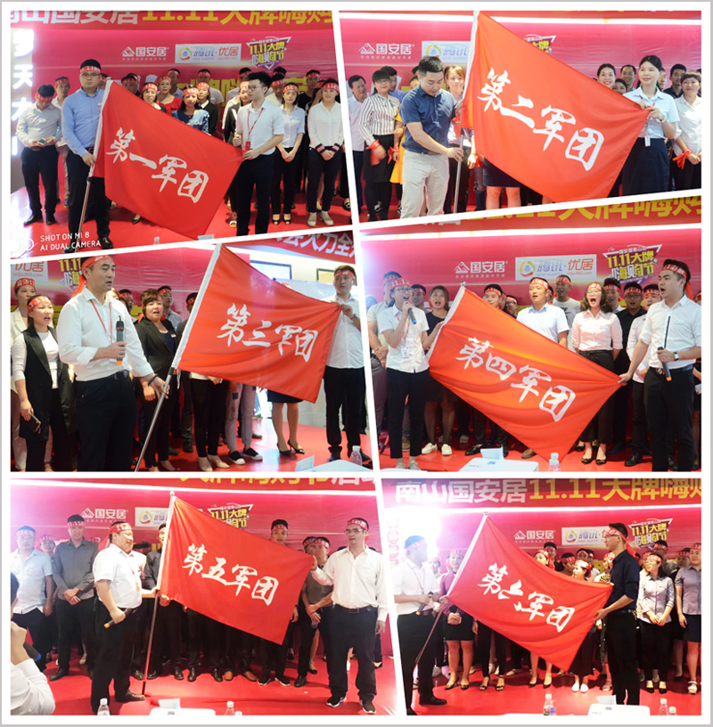 隨后,來自南山店全體方陣隊員高舉隊旗,高喊口號,將現(xiàn)場氣氛推向高潮,品牌代表們紛紛上臺發(fā)言,幾百家建材家具品牌以第一軍團、第二軍團、第三軍團、第四軍團、等等團隊方陣,登場亮相,高呼團隊口號,并且當(dāng)場簽署了“雙11大促”的軍令狀,并從商場負(fù)責(zé)人手中接過了“雙11大促”的軍旗,這將預(yù)示著“國安居南山店&騰訊優(yōu)居雙11大牌嗨購節(jié)”定將以卓越的佳績,創(chuàng)造新一輪的銷售盛況!