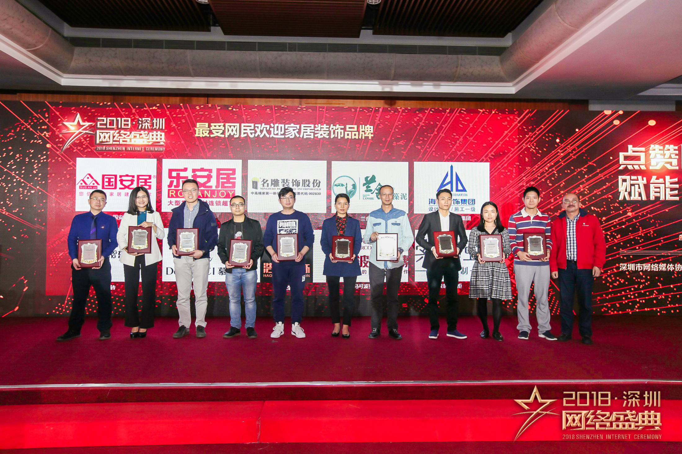 盛典現(xiàn)場(chǎng)“2018年度十大行業(yè)最受網(wǎng)民歡迎品牌”獲獎(jiǎng)名錄正式對(duì)外公布。國(guó)安居;樂(lè)安居;名雕裝飾股份;蘭舍硅藻泥;海大裝飾;東鵬瓷磚;慕思寢具;浩天裝飾;馬可波羅瓷磚;索菲亞衣柜10個(gè)品牌獲得“2018年度家居裝飾行業(yè)最受網(wǎng)民歡迎品牌”榮譽(yù)稱號(hào)。