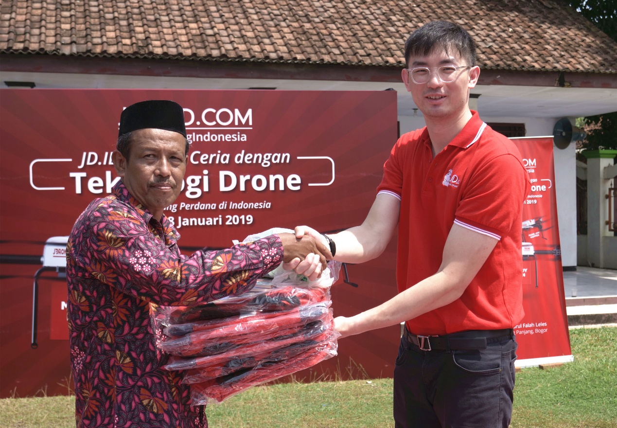 京東印尼 CEO章力(右)將捐贈物資交給當(dāng)?shù)匦W(xué)校長