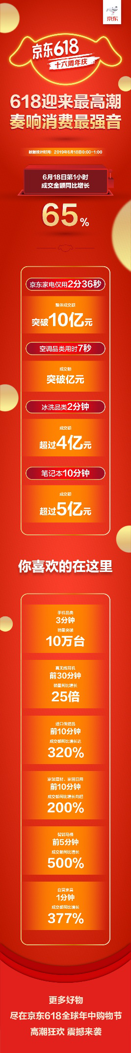 深圳新聞網(wǎng)2019年6月18日訊 6月18日零點(diǎn)的鐘聲猶如一聲清脆的發(fā)令槍,京東618十六周年慶迎來了18天中的下單最高潮,中國億萬消費(fèi)市場(chǎng)的旺盛活力在這一刻盡情綻放,第一個(gè)小時(shí)的成交金額同比增長65%,京東在618這場(chǎng)席卷全民消費(fèi)熱潮中的核心地位進(jìn)一步凸顯。