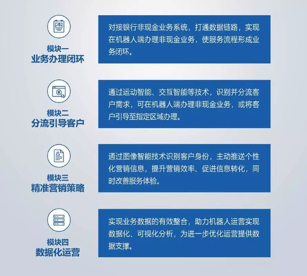 人工智能機器人與金融業(yè)務的完美結合,助力加速金融網(wǎng)點智能化建設、提升營銷效率、豐富金融營銷場景。