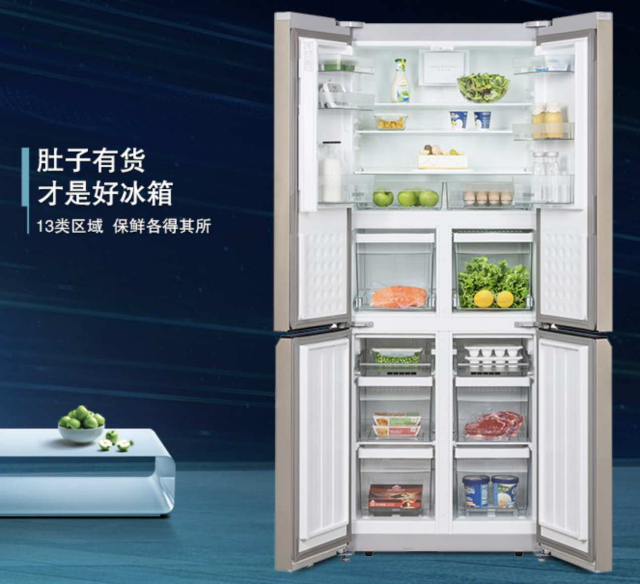 西門子KM46FA30TI采用十字對開門設計,不僅簡約美觀,容積更是達到了452升,13類區(qū)域設置,讓每份食物都各得其所,滿足了家庭更多的儲存需求?;炖潆p動力、風冷無霜、零度保鮮,可以讓蔬菜水果保持新鮮水嫩,也可以讓魚、肉營養(yǎng)不流失,鮮嫩如常。LCD顯示+觸摸控制,嵌入式門把手,閉門系統(tǒng),它不妥協(xié)任何細節(jié),盡顯人們生活品味。