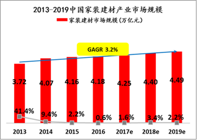 億歐智庫數(shù)據(jù)顯示,目前家裝市場復合年增長率維持在3.2%,2019年家裝市場銷售規(guī)模接近4.5萬億,但家裝建材互聯(lián)網(wǎng)滲透率小于10%,經(jīng)營模式以傳統(tǒng)的區(qū)域性“散打”為主,無法滿足90后主體消費者互聯(lián)網(wǎng)化、社交化、全國性購買的需求,家裝行業(yè)大整合的呼聲越來越高。