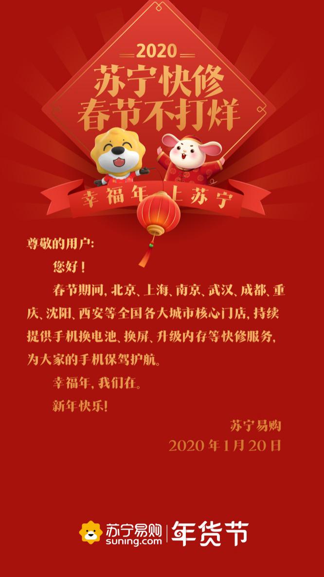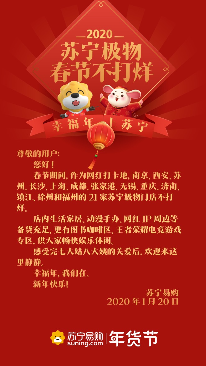 蘇寧則在公告中強調(diào),春節(jié)期間,北京、上海、廣州、南京、武漢、成都、沈陽、杭州、深圳、重慶、西安等200多個城市,可實現(xiàn)次日達、預(yù)約送。全國300多個城市支持照常下單。