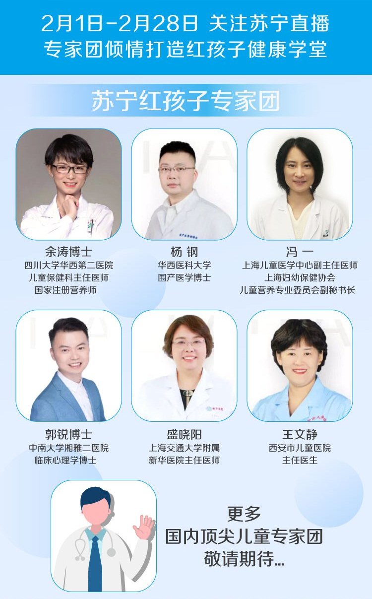 蘇寧紅孩子聯(lián)合惠氏、雀巢、佳貝艾特、美贊臣、伊利,邀請到北京協(xié)和醫(yī)院、、上海交通大學附屬新華醫(yī)院、廣州市婦女兒童醫(yī)療中心、中南大學湘雅二醫(yī)院、華西醫(yī)科大學、華西第二醫(yī)院、首都醫(yī)科大學附屬北京婦產(chǎn)醫(yī)院、上海交通大學醫(yī)學院附屬國際和平婦幼保健院等醫(yī)院的主任醫(yī)師以及醫(yī)科大學的醫(yī)學博士組成專家團,通過蘇寧直播為孕產(chǎn)婦直播講解孕媽乳媽、兒童防護措施,以及如何避免寶寶交叉感染的防護措施和建議。