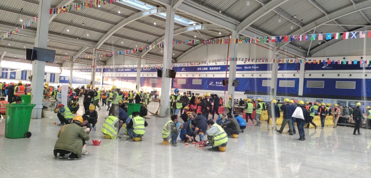 雷神山現(xiàn)場(chǎng),工人中午就餐