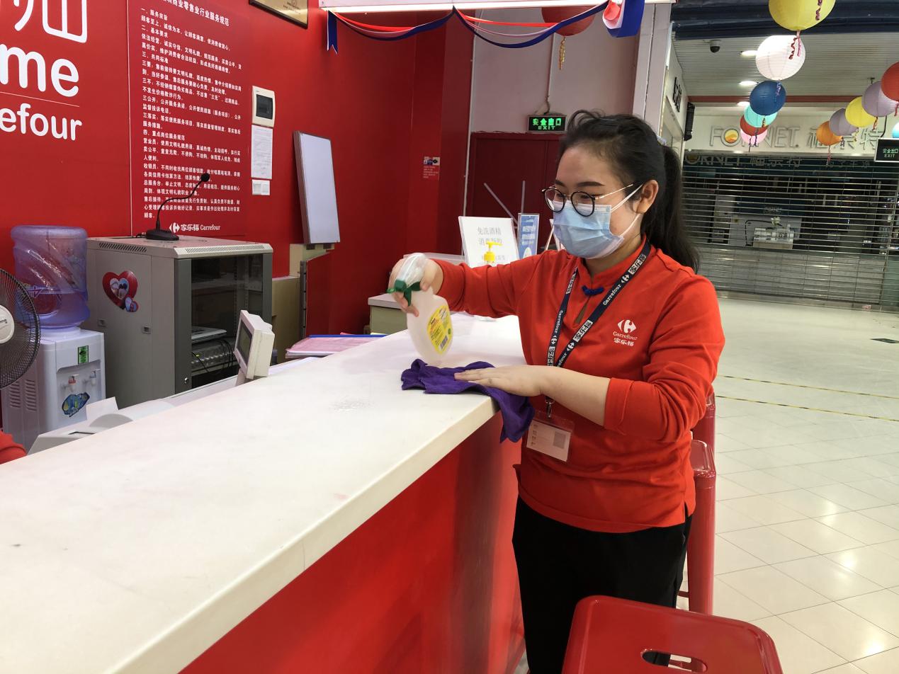陳翠姣這次被分配到了超市收銀部門,由于是標準化操作,加上使用移動支付的顧客較多,技術難度不大,在資深員工的耐心指導下,她上手很快。陳翠姣表示對新崗位很滿意,她說,賦閑在家太久了,這次能換崗上任,很開心,“尤其是能夠加入到保障城市民生供應的大型商超,非常有意義?!毕挛?點,陳翠姣為服務中心柜臺做第三次消毒清潔后,便可以結束今日的早班工作,打卡下班了。