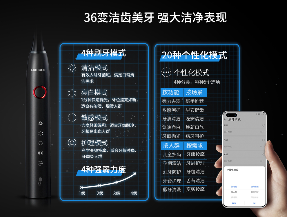 力博得智能聲波牙刷·星鉆的卓越體驗(yàn)源自HUAWEI HiLink智能科技加持。它支持華為智慧生活A(yù)PP,用戶只需在手機(jī)上下載安裝華為智慧生活A(yù)PP,簡(jiǎn)單三步連接后,就能對(duì)牙刷進(jìn)行智能操控,可以對(duì)6區(qū)16面口腔實(shí)時(shí)可視化監(jiān)測(cè),看見(jiàn)刷牙位置,進(jìn)行30秒換區(qū)提醒,2分鐘科學(xué)計(jì)時(shí)以及刷牙引導(dǎo)、力度姿勢(shì)糾正、壓力控制提示,全面清潔無(wú)遺漏。此外,華為智慧生活A(yù)PP內(nèi)置20種場(chǎng)景模式,不斷更新升級(jí),給用戶帶來(lái)更多探索樂(lè)趣。