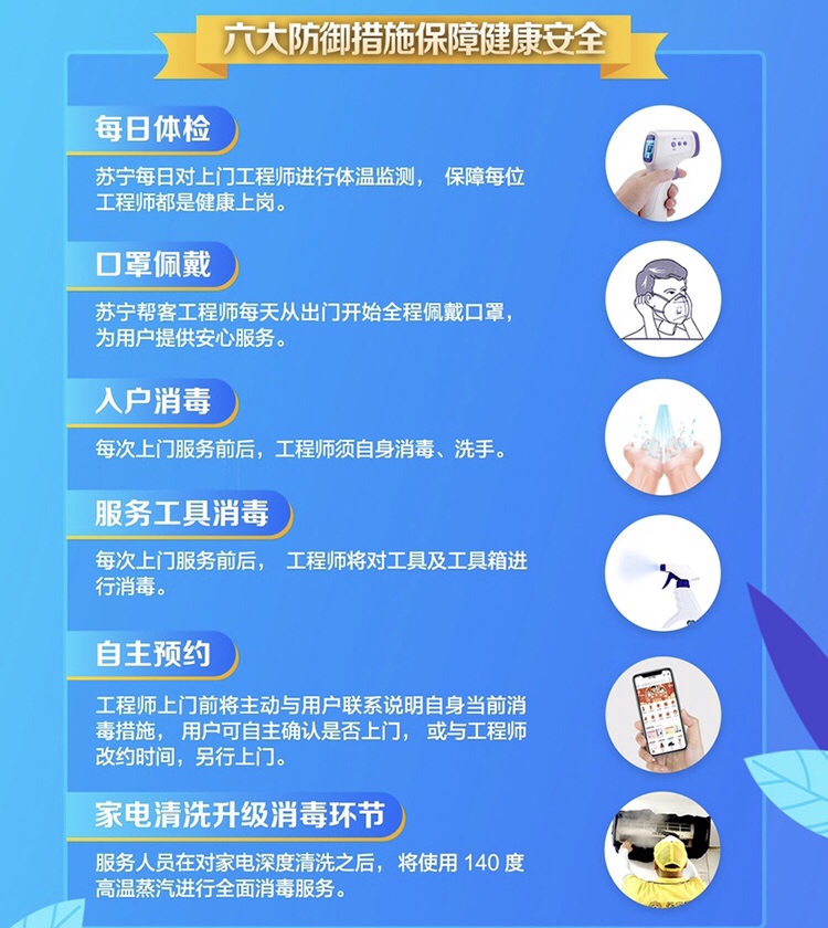 據(jù)了解,該承諾卡是蘇寧創(chuàng)建,主要承諾內(nèi)容包括服務(wù)前的體溫檢測、工具消毒、個人防護;服務(wù)中的工程師全防護、工具不落地、與用戶保持安全距離;服務(wù)后的機器清潔、線上保修減少上門以及清理服務(wù)現(xiàn)場。