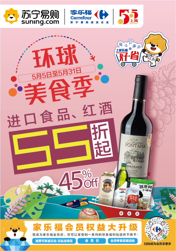 此外,家樂福方面還宣布將加大投入,全面支持上?!拔逦遒徫锕?jié),全城打折季”。5月5日至31日,上海地區(qū)家樂福門店將開啟“環(huán)球美食季”,精選來自法國、意大利、英國、西班牙、美國、加拿大、日本、韓國、馬來西亞等39個國家的350個品牌旗下共計3700多種進口食品,與上海消費者共襄盛舉。美食自然少不了美酒相伴,來自法國、意大利、西班牙、阿根廷、智利、澳洲等國家的70多個品牌旗下共計200多種進口葡萄酒,也將悉數(shù)亮相全市家樂福門店?;顒悠陂g,進口食品低至5.5折起,進口紅酒買一送一。進博會“同款”法國奧格斯汀系列葡萄酒也將首次參與促銷,葡萄酒愛好者不容錯過。