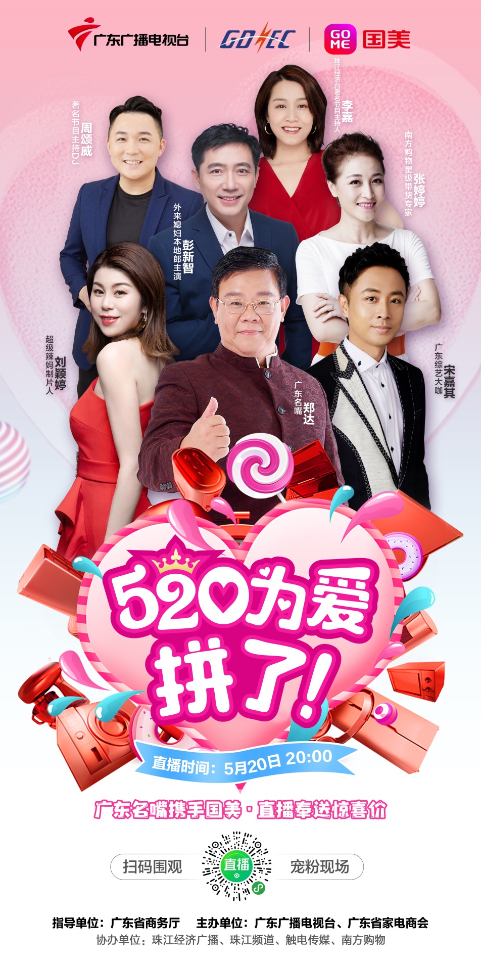 見圳客戶端·深圳新聞網(wǎng)2020年5月15日訊 在廣東省商務(wù)廳指導(dǎo)下,由廣東廣播電視臺(tái)、廣東省家電商會(huì)和華南國美聯(lián)合舉辦,“520為愛拼了”超級(jí)直播將于5月20日晚8點(diǎn)整驚喜開播!廣東名嘴鄭達(dá)、綜藝大咖宋嘉其、影視演員彭新智攜一眾明星主播為廣東省的街坊們帶來空調(diào)、冰箱、洗衣機(jī)、電視、手機(jī)等大批家電潮品!屆時(shí),主播們不僅給街坊們帶來意想不到的低價(jià),直播中還會(huì)不間斷抽出手機(jī)、家電等大批豪禮,敬請(qǐng)期待!這次直播是全國首次大小屏同步直播,街坊們不僅可以通過美店商城、看點(diǎn)直播、京東、珠江頻道直播小程序、珠江經(jīng)濟(jì)廣播呼啦直播小程序、南方購物直播小程序、觸電新聞APP等平臺(tái)在線觀看并下單,而且還可以打開南方購物電視頻道下單購買。
