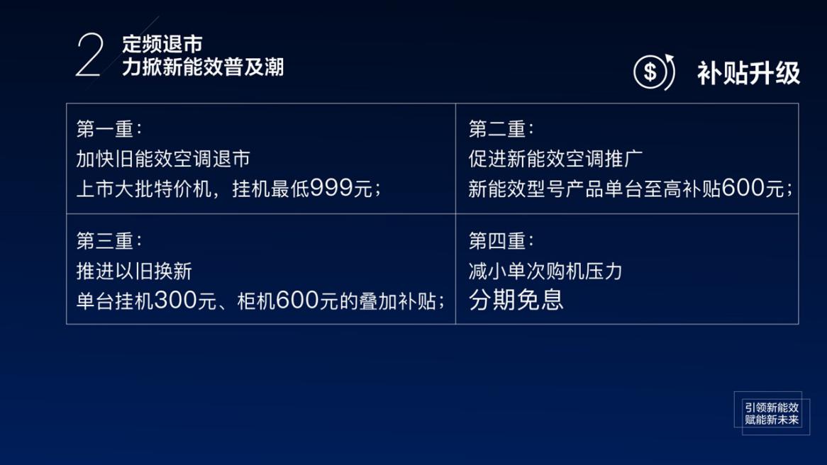 同時(shí),“新一級能效聯(lián)盟”還將持續(xù)開展“空調(diào)節(jié)能風(fēng)暴”等綠色消費(fèi)讓利活動。該活動涵蓋四重補(bǔ)貼,分別是老能效清倉、新能效補(bǔ)貼、以舊換新及分期免息,多管齊下加速新舊能效產(chǎn)品的切換、擴(kuò)大綠色消費(fèi)規(guī)模。