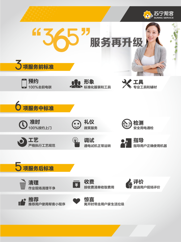 “三分產(chǎn)品七分安裝”,超60萬套空調(diào),如何保障快速及時(shí)的安裝?蘇寧幫客負(fù)責(zé)人告訴記者,蘇寧全國區(qū)域空調(diào)售后服務(wù)堅(jiān)持貨到24小時(shí)上門安裝的服務(wù)時(shí)效,并按照用戶預(yù)約時(shí)間準(zhǔn)時(shí)上門。不僅如此,全國蘇寧幫客空調(diào)安裝服務(wù)統(tǒng)一堅(jiān)持365服務(wù)標(biāo)準(zhǔn),覆蓋作業(yè)前、中、后期的工服、工牌、鞋套、墊機(jī)布、收費(fèi)標(biāo)準(zhǔn)、衛(wèi)生維護(hù)等多項(xiàng)標(biāo)準(zhǔn),并歡迎用戶監(jiān)督。