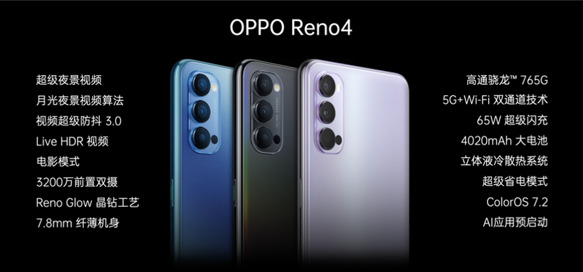 此次發(fā)布會上,OPPO還發(fā)布了OPPO Reno4,同樣搭載高通驍龍?765G5G芯片及65W超級閃充;后置搭載4800萬+800萬+200萬超清激光對焦三攝,前置雙攝為3200萬+200萬組合,同樣具備超級夜景視頻、視頻超級防抖3.0等視頻拍攝功能。