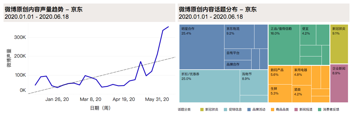 6月與疫情相關(guān)的話題內(nèi)容已降至全部話題的3%,表明用戶對疫情的關(guān)心已逐漸轉(zhuǎn)回到京東平臺核心功能上,即平臺的電商本質(zhì)。在用戶體驗方面的反饋中,提及“京東值得信賴”的內(nèi)容占比近45%。京東在疫情爆發(fā)期間包括物資捐贈,醫(yī)療物資運輸?shù)仍趦?nèi)的舉措使京東得到了社交媒體用戶的肯定與贊揚。在618購物節(jié)開始后,用戶對京東平臺的討論也更多集中在“平臺大”、“信得過”等方面。