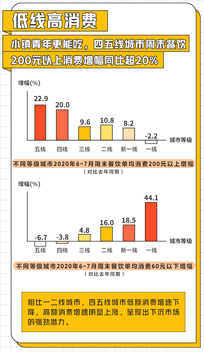 在周末消費(fèi)趨勢中,《2020周末餐飲堂食消費(fèi)趨勢洞察》還指出,相較于一二線城市,四五線等下沉市場高額消費(fèi)增速明顯上漲,200元以上消費(fèi)增幅超20%,顯示出強(qiáng)勁潛力。