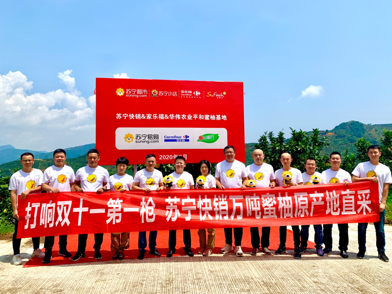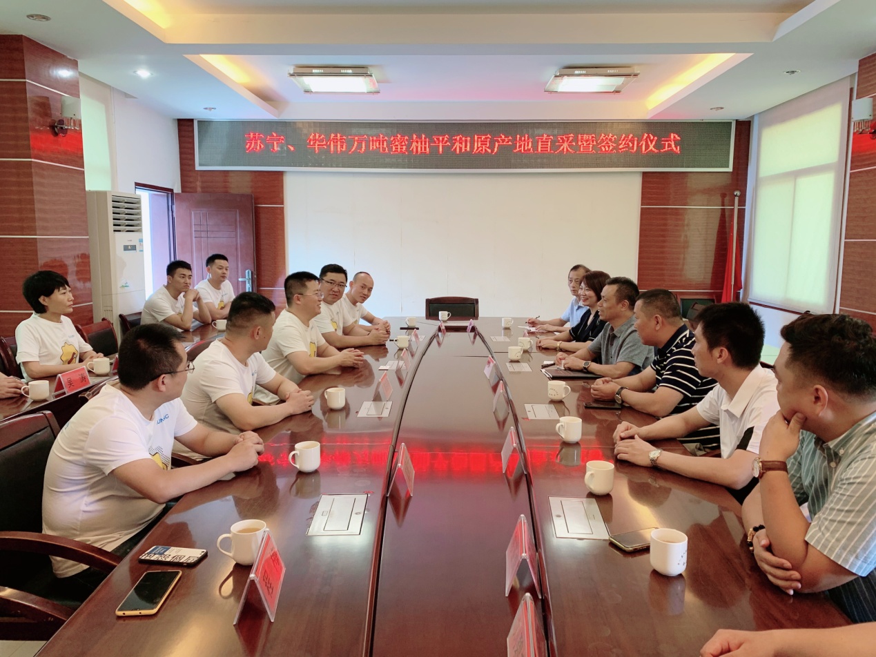 8月26日,蘇寧家樂福中國區(qū)生鮮采購總監(jiān)孫樂超、水果組總監(jiān)孟碩、華南區(qū)采購總監(jiān)周益明,以及蘇寧易購水果組采銷總監(jiān)戴躍等一行來到位于福建省平和縣的華偉農業(yè)蜜柚基地,與平和縣委書記郭德志等地方領導共同宣布蘇寧家樂福&華偉農業(yè)蜜柚直采基地的正式啟動。