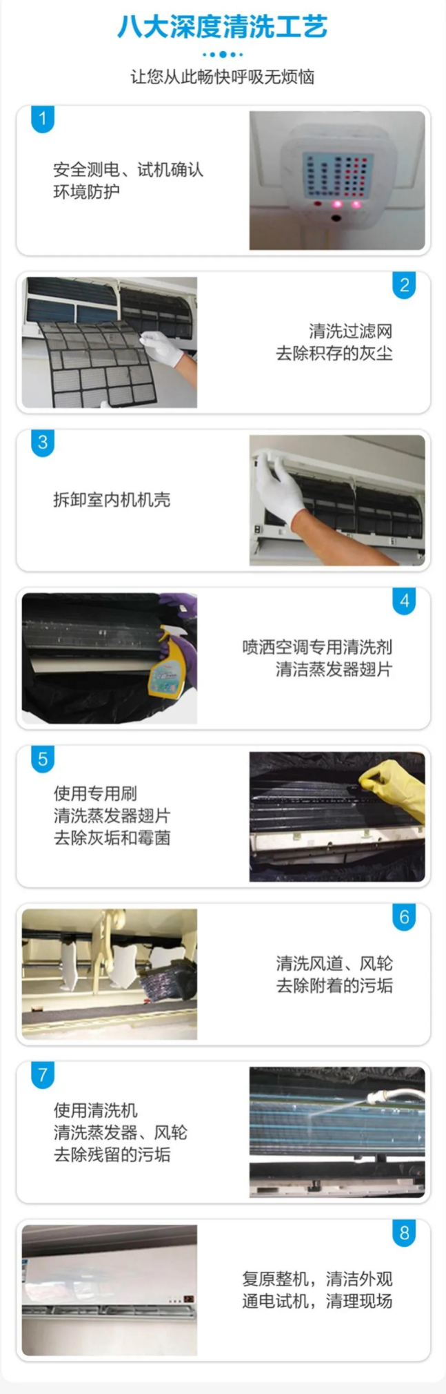 “家里最老的那臺空調(diào)應(yīng)該是09年買的,一直也沒有清洗過”莊老師介紹說。和用戶平常在家做的沖洗過濾網(wǎng)的簡單清潔不同,海爾空調(diào)服務(wù)工程師對空調(diào)進(jìn)行深度清洗。通過專業(yè)空調(diào)清洗劑以及高壓水槍進(jìn)行"一臺空調(diào)洗三遍"深度清洗服務(wù):拆洗一遍,沖洗一遍,高溫蒸汽除菌一遍,并對空調(diào)用電進(jìn)行安全檢測,全方位呵護(hù)用戶及家人的健康呼吸。