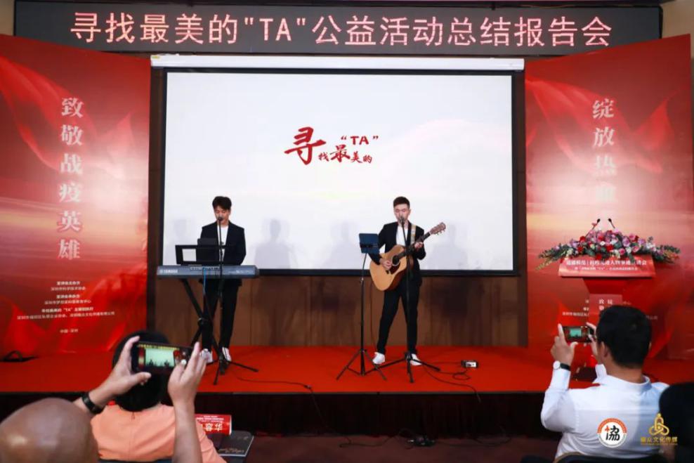 活動(dòng)尾聲,會(huì)場(chǎng)響起一首滿懷敬意及祝愿的歌聲——尋找最美的“TA”公益活動(dòng)主題曲《無名英雄》。這是由畢業(yè)于中國音樂學(xué)院并多次參演央視春晚、與郎朗同臺(tái)演奏的孫培軒與民謠吉他創(chuàng)作歌手強(qiáng)曉龍共同親情獻(xiàn)唱的原創(chuàng)戰(zhàn)疫歌曲,現(xiàn)場(chǎng)的各位嘉賓及觀眾無不感動(dòng),感謝無名的英雄們用那堅(jiān)如磐石的雙肩,踐行著初心使命及鏗鏘有力的誓言。