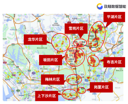 從熱力圖中可以看出,10號(hào)線客流集中居住在三大片區(qū):平湖、雪崗、坂田,深圳地鐵10號(hào)線的開通,結(jié)束了三大片區(qū)內(nèi)多數(shù)區(qū)域不通地鐵的歷史,這三個(gè)大片區(qū)的居民成為了10號(hào)線的主力乘客。