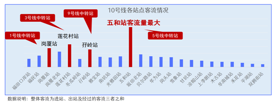 可以看到,10號(hào)線客流最大的為五和站。五和站作為10號(hào)線與5號(hào)線的中轉(zhuǎn)站,方便大量的5號(hào)線中轉(zhuǎn)人群。